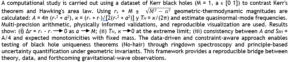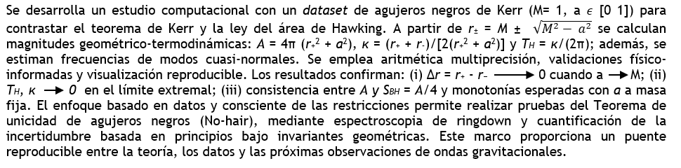 agujero negro de Kerr, Ley del área de Hawking, Modos cuasi-normales, espectroscopía de ringdown, gravedad de superficie, termodinámica de agujeros negros, ciencia de datos reproducibleResumen